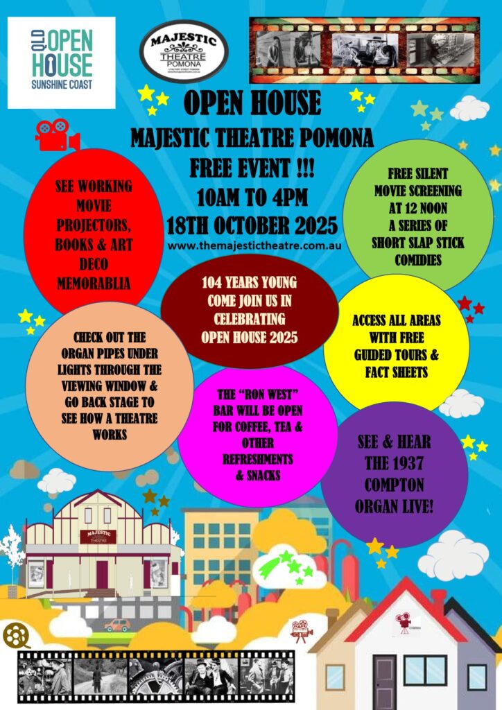 October 18, 2025 @ 10:00 am – 4:00 pm – OPEN HOUSE is back at the Majestic in 2025. If you’ve ever wondered what goes on behind the scenes at a theatre or you’re interested in old movie cameras, projectors, movie memorabilia, deco buildings, organs or a slice of QLD history then head to the Majestic Theatre Pomona on Saturday 18th October for Open House […]