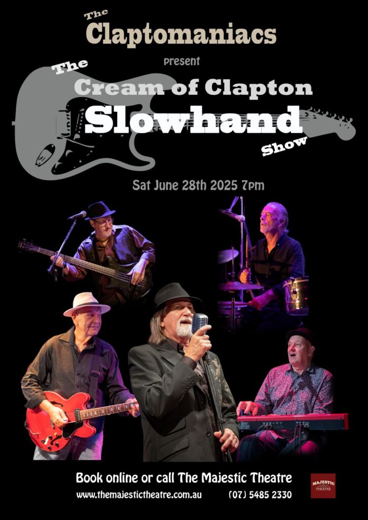 June 28, 2025 @ 7:00 pm – 9:30 pm – The Claptomaniacs are back, with “The Cream of Clapton – The Slowhand Show”. A a special ticketed event, showcasing live the Clapton/Cream material from their much-loved tribute show. The musical program follows the history of ‘Slowhand’(Clapton), from his 60s pop and blues days, into the supergroup Cream, and then as a solo artist. The show will be enhanced […]